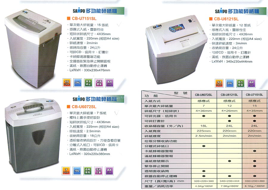 SAMPO聲寶 CB-U6072SL/U6121SL/U7151SL 碎紙機